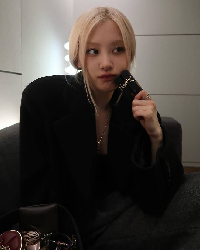 로제는 여유로운 오버핏의 블랙 재킷에 다크 그레이 울 팬츠를 매치해전체적으로 절제된 무드의 데일리룩을 연출했습니다.이너는 슬림한 블랙 탑을 착용해 톤온톤 레이어링을 완성했으며,가볍게 묶은 플래티넘 블론드 헤어와 함께 차분한 분위기를 더했습니다.