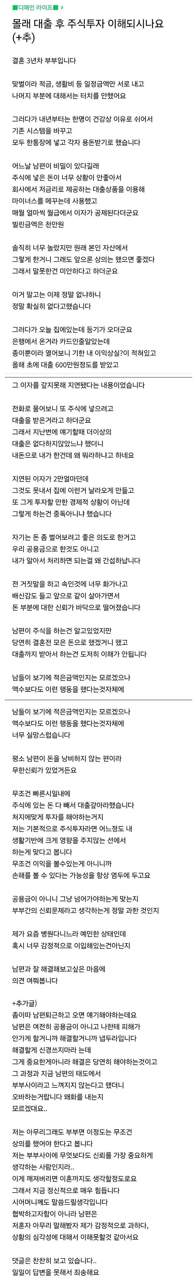 몰래 대출받고 주식 투자한 남편때문에 고민인 여자
