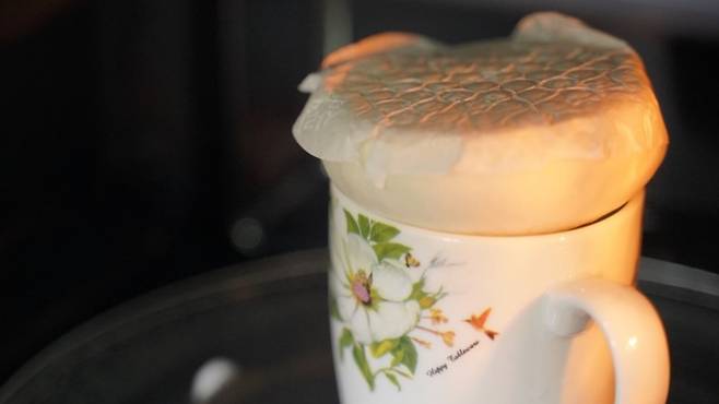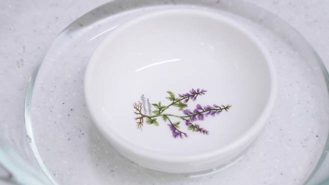 물 위에 조그마한 종지기를 올려놓으세요. 마찬가지로 미리 전자레인지에서 1분 정도 돌려 물을 뜨겁게 데워 놓으세요.