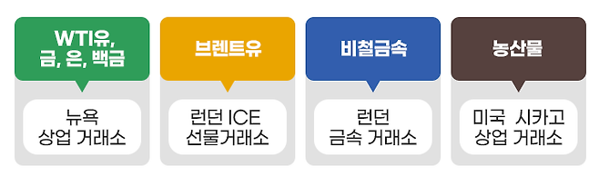 WTI유, 금, 은, 백금 등은 뉴욕 상업 거래소, 브렌트유는 런던 ICE 선물거래소, 비철금속은 런던 금속 거래소, 농산물은 시카고 상업 거래소에서 많은 거래가 이루어집니다.