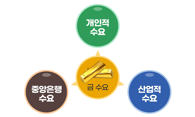 금은 크게 3가지의 수요가 있는데, 장신구 또는 단순 보유를 위한 개인의 수요, 각국의 중앙정부에서 보유하기 위해 매입하는 수요, 의료산업 및 전자산업 등의 산업적 수요 등이 있습니다.