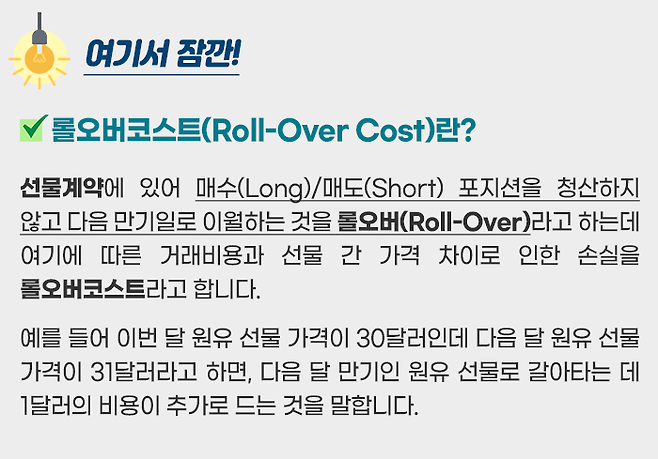 선물 ETF는 선물을 계속 갈아타면서 발생할 수밖에 없는 롤오버코스트가 발생하지 않는 장점이 있으며, 원자재 선물거래가 모두 외국에서 이루어지기 때문에 선물 ETF는 환헤지를 하고 있는 반면 현물 ETF는 환헤지를 하고 있지 않습니다.