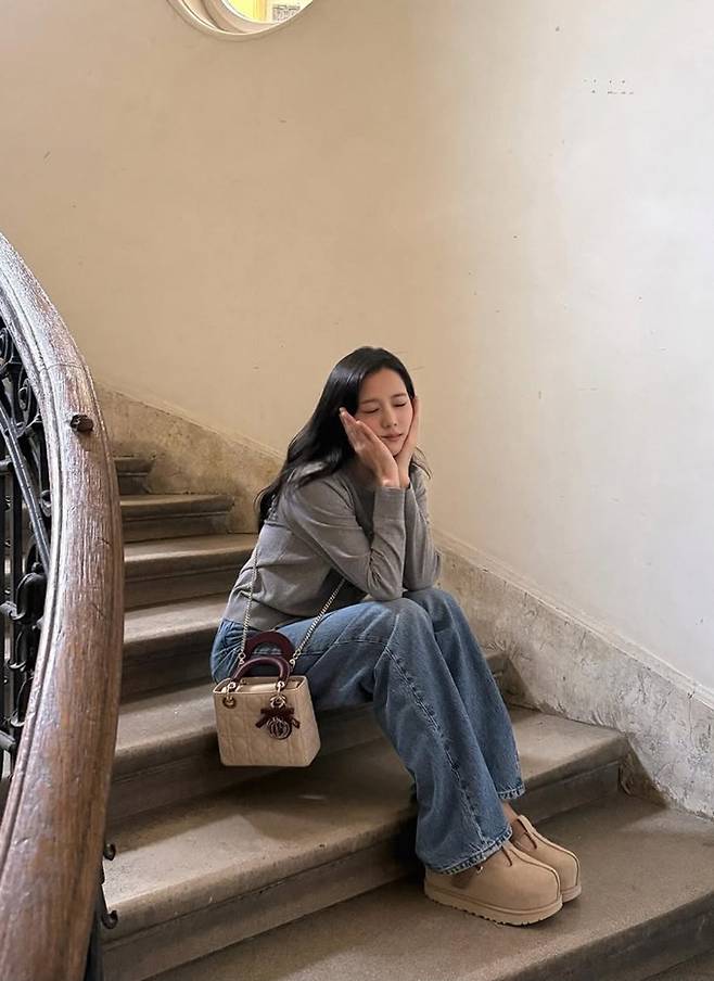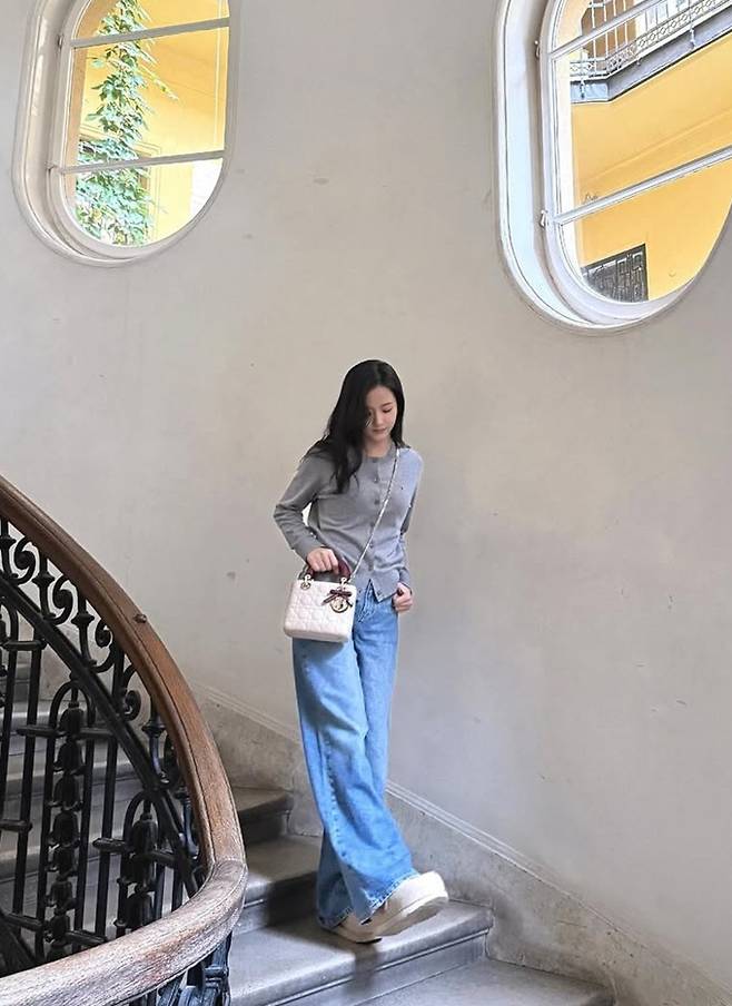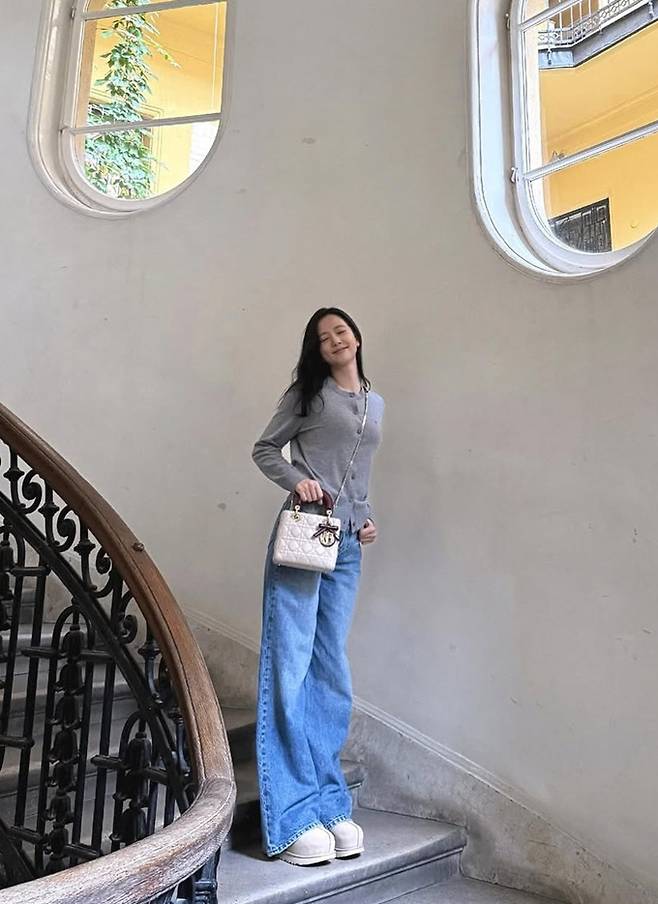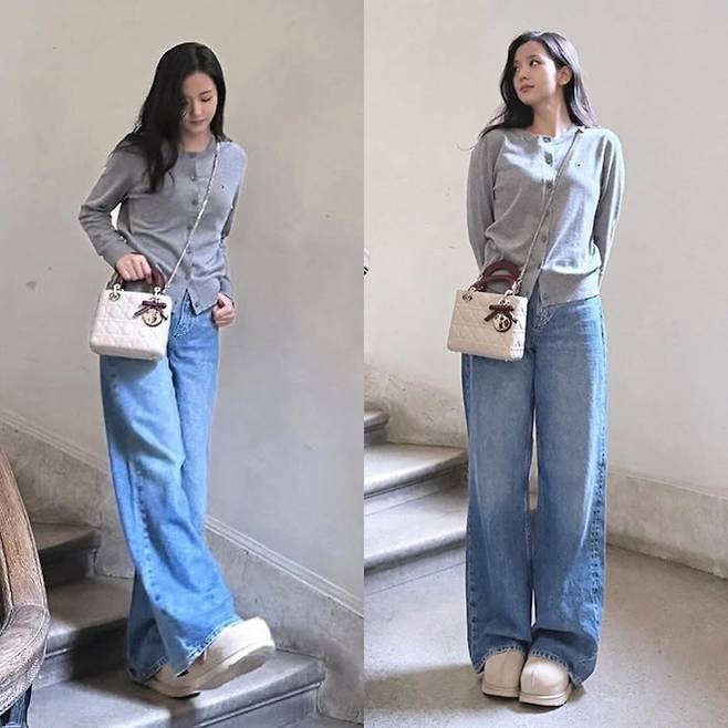 공개한 사진에서 지수는 그레이 카디건에 루즈 핏 라이트 블루 와이드 데님 팬츠를 매치한 데일리룩으로 내추럴하면서도 세련된 무드를 연출했다.