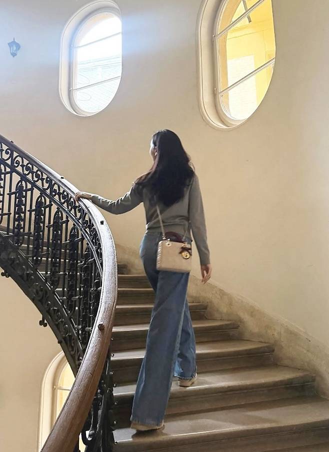 여기에 크림 톤의 플랫폼 슈즈로 캐주얼한 포인트를 더했으며, 베이지 톤의 디올 ‘레이디 디올 백’으로 고급스러움을 놓치지 않았다.