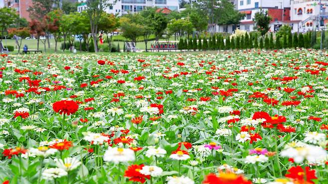 철새공원 정원에 들어서면 눈앞에 펼쳐지는 것은 끝없이 이어지는 붉은 백일홍 꽃밭입니다.