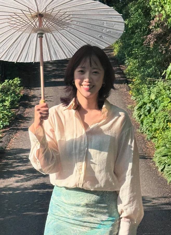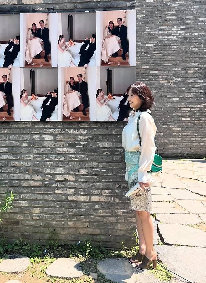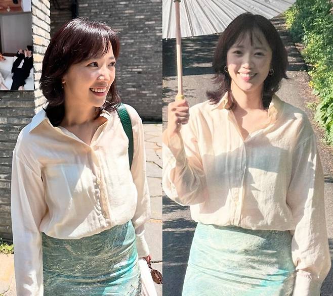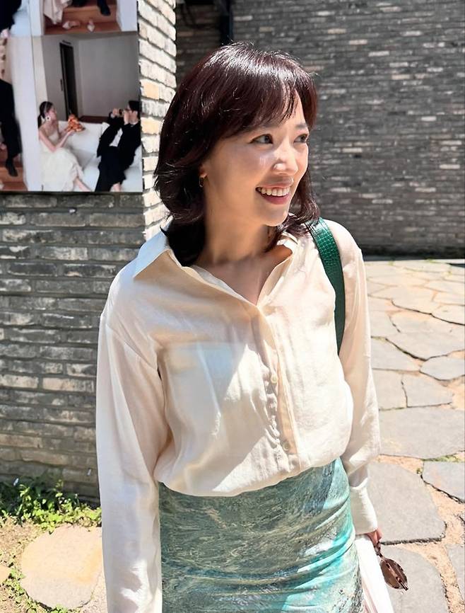 공개한 사진에서 전혜진은 하늘색 미디 길이의 스커트에 셔츠를 매치한 미니멀한 하객룩으로 심플하면서도 예쁜 예식 스타일을 연출했다.