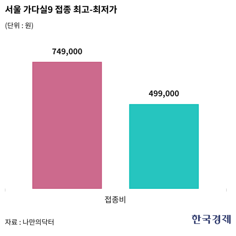 서울 내 의원급 의료기관에서도 차이가 컸다. 서울 지역내 최저가는 49만9000원(종로)였으며, 최고가는 74만9000원으로 약 25만원 가량의 차이가 났다. 수도권 평균 가다실9 3회 평균 접종비용은 59만9244원이다.