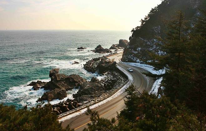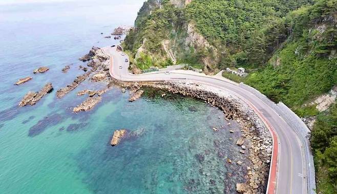 절벽을 따라 도로가 나 있어 운전 중에도 동해의 푸른 수평선을 가까이에서 감상할 수 있다.