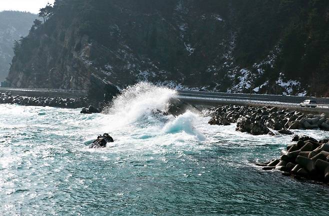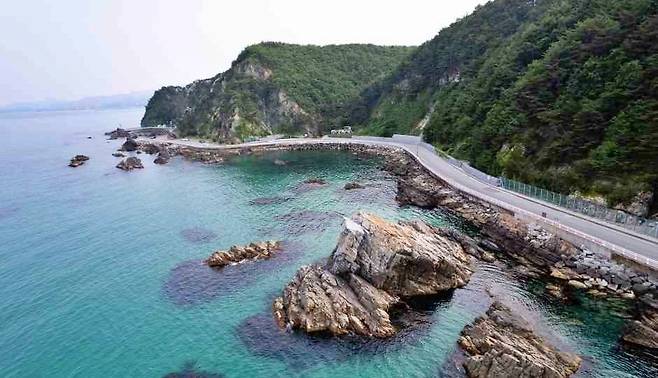 절벽을 따라 도로가 나 있어 운전 중에도 동해의 푸른 수평선을 가까이에서 감상할 수 있다.