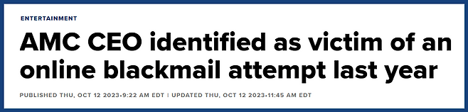 국내 투자자들에게도 일명 ‘밈주식’으로 유명한 AMC는 미국의 영화관 기업이야! 이 기업의 CEO인 아담 아론은 작년에 사코야 블랙우드라는 여성으로부터 협박을 당했다고 밝혔어. 그는 협박에 굴복하는 것이 아니라, 전문적인 도움의 손길을 구해 법적인 절차를 밟았고 이 사건을 공론화시켰지. 상장 기업의 CEO로서 잡음이 나는 게 두려웠을 수도 있는데, 용감한 선택을 한 거야!