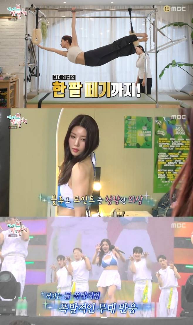 먼저 이날 방송에는 '워터밤' 공연 당일 필라테스 숍을 찾은 권은비의 모습이 그려졌다. 공연 6시간 전 운동에 매진하는 모습에 놀라는 MC들에게 "당일에 펌핑을 해야 잔근육이 보인다"라며 프로페셔널한 모습을 보였다.