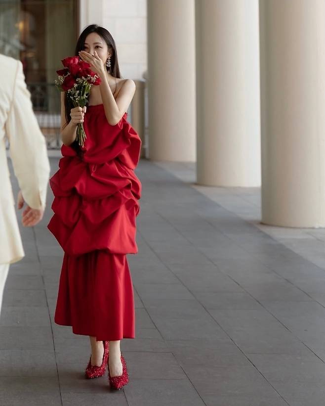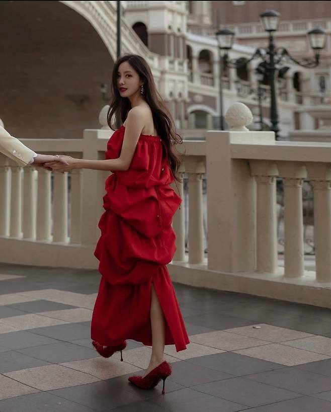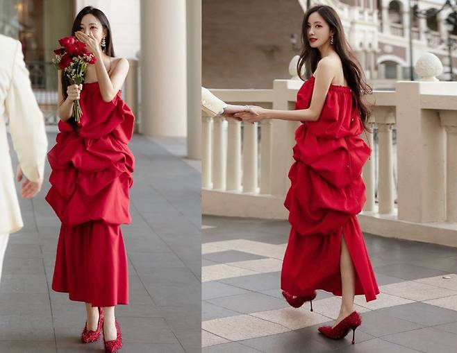 효민은 입체적인 러플이 다층으로 구성된 과감한 실루엣의 오프숄더 레드 드레스를 선택해 극강의 존재감을 드러냈습니다.