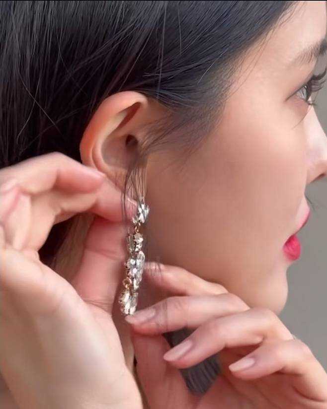 특히 동일 컬러의 퍼 디테일 스틸레토 힐을 매치해 통일감 있는 컬러 스타일링을 연출했고, 긴 웨이브 헤어와 함께 화려한 귀걸이로 마무리하며 화보 같은 비주얼을 완성했습니다.