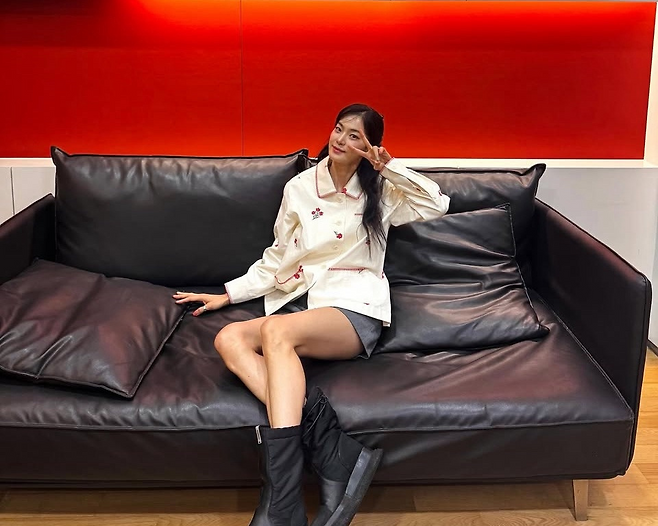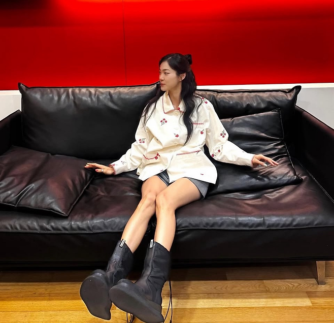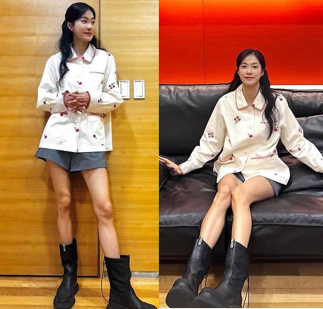 그레이 쇼츠와 함께 매치해 상큼한 캐주얼룩을 완성했으며, 투박한 플랫폼 블랙 부츠로 균형감을 더해 귀여움과 시크함이 공존하는 믹스매치 스타일을 선보였습니다.