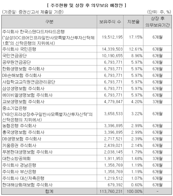 구주매출에 참여하지 않고 기존 보유수량을 상장 이후까지 유지하기로 한 기관도 있었다. SC제일은행과 KB국민은행이 대표적이다. SC제일은행은 '삼성SOC코어인프라일반사모특별자산투자신탁제1호' 신탁은행 지위로 KB발해인프라 주식 1951만2195주를 보유한 지분율 17.15%의 최대주주다. KB국민은행은 12.61%(1433만9503주)를 가진 2대주주다.