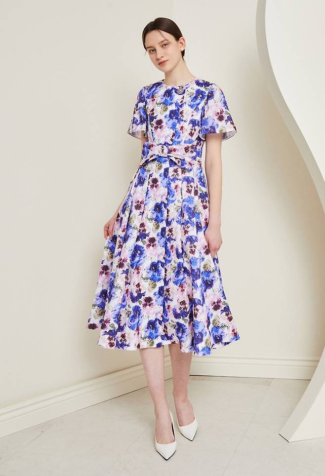 화려하고 입체감 넘치는 플라워 패턴이 돋보이는 원피스 제품으로 탈착의 가능한 빅 리본과 벨티드 포인트 디자인으로 페미닌한 실루엣을 연출한다.