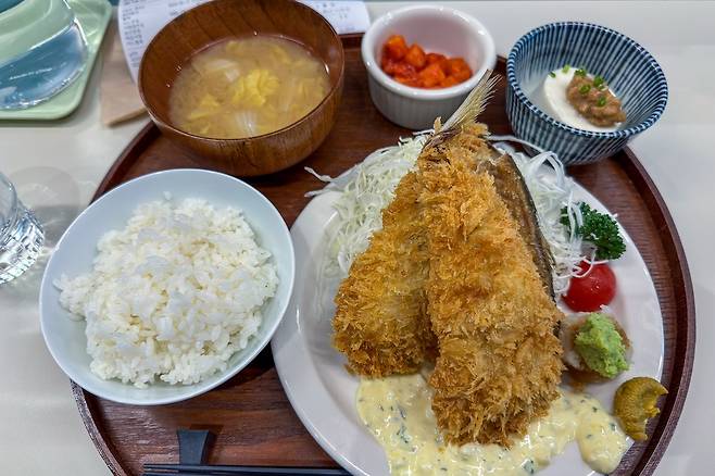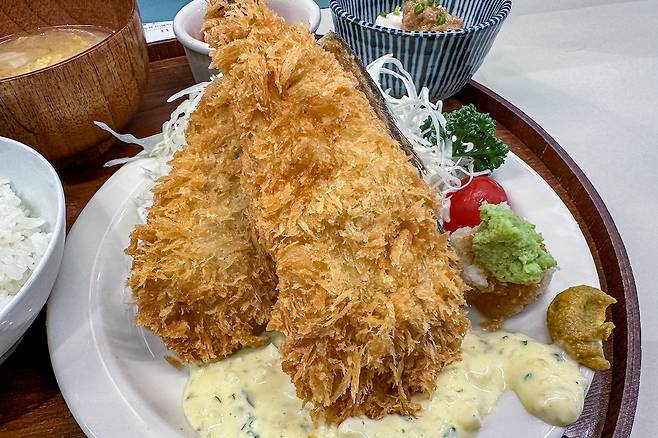 아지후라이정식을 주문했다. 양배추 위에 아지후라이가 2조각이 나오고 아지뼈를 통으로 튀겨 내놓는다. 이곳만의 타르타르소스에 찍어 먹어도 좋고 특제 된장소스(마늘미소) 혹은 무즙와사비, 겨자 등 내주는 모든 소스가 잘 어울린다. 우리가 흔히 먹는 대구살 생선까스보다는 살이 조금 얇은 편이지만, 전갱이의 깊은 맛을 느낄 수 있다.
