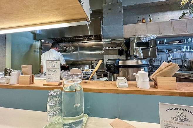 보통의 튀김집은 기름 냄새가 쩔어서 실내에서 먹기가 불편한 곳도 많은데 튀김을 메인으로 하는 가게로는 환기도 잘되고 냄새도 심하지 않았다. 기름을 잘 쓰던지, 환기를 신경 쓴 것인지는 모르겠지만 꽤 운영을 잘한다는 생각이다. 가게도 작은 규모인 것은 두 사람이 운영하기에 최적화를 하신 듯. 욕심을 부리기보다 최적의 가게를 운영하겠다는 생각을 읽을 수 있었다. \