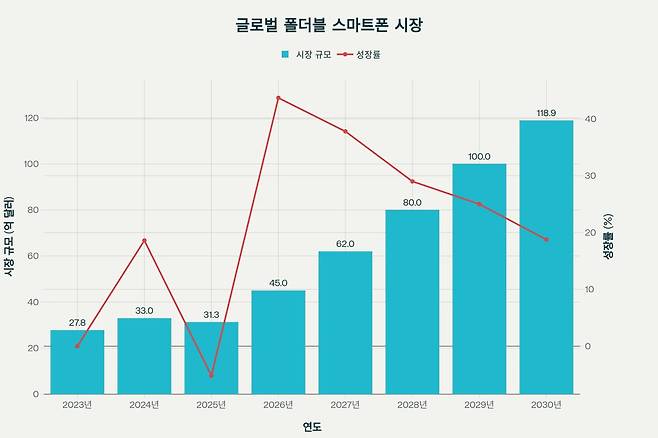 글로벌 폴더블 스마트폰 시장은 빠른 성장세를 보이고 있다. 2025년 시장 규모는 약 313억 달러로 추정되며, 2030년에는 약 1,189억 달러에 달할 것으로 예상되고 있으며, 예측 기간의 연평균 성장률은 30.59%에 이를 것으로 전망된다.