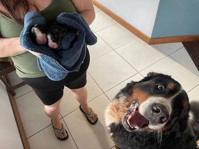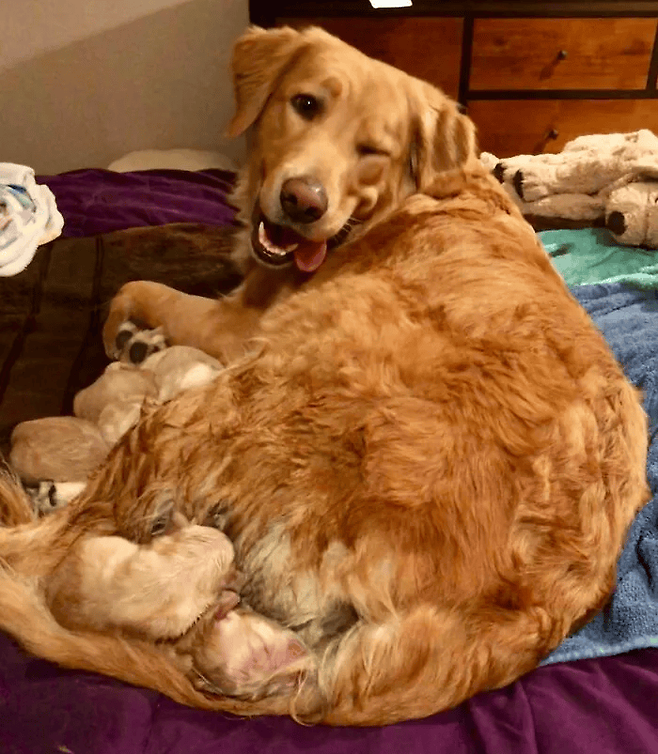 이제 막 태어난 아이들을 보며 자랑스러운 표정을 짓고 있는 부모견입니다.