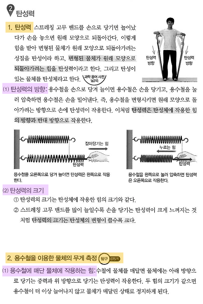 이제 다른 색 형광펜을 꺼내어 하위 개념의 소제목을 칠한다. 소제목은 곧 ‘개념’이다. 탄성력 부분의 세부 내용은 세 가지다. 첫째는 탄성력의 개념(🟡노란색 형광펜), 둘째는 탄성력의 성질(🟣보라색 형광펜), 셋째는 탄성력의 크기(🟣보라색 형광펜)다.