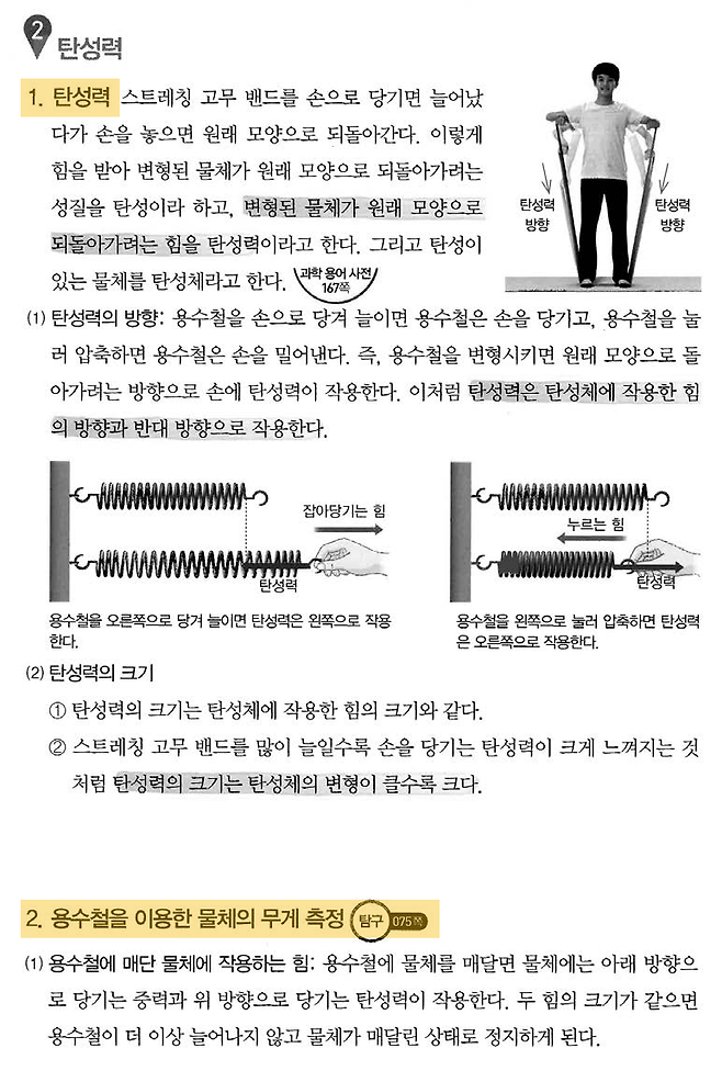‘탄성력’이라는 파트에는 크게 두 가지 내용, 두 가지 폴더가 있다는 것을 확인하자. 첫 번째 폴더는 ‘탄성력’이고, 두 번째 폴더는 ‘용수철을 이용한 물체의 무게 측정’이다. 장기기억 속에 폴더를 만든다는 감각을 기억하자.(🟡노란색 형광펜)