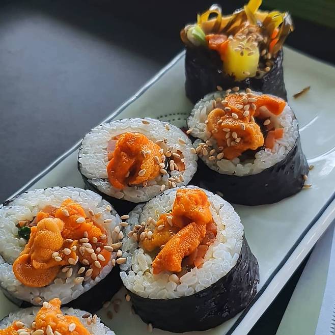 부산 영도 바다를 바로 앞에서 바라보며 먹을 수 있는 부산 영도 '옥천회집'. 회와 해산물, 각종 해물라면 등이 준비되어 있지만 가장 인기있는 메뉴는 바로 녹진한 성게알이 가득 올라간 성게알김밥이다. 집에서 싼 것 같은 김밥 위에 성게알이 올라간 성게김밥은 입안에 넣으면 바다향이 가득 느껴진다. 싱싱한 성게알이 올라간 김밥과 푸른 오션뷰와 함께 특별한 한끼 식사를 만끽해 보시길.