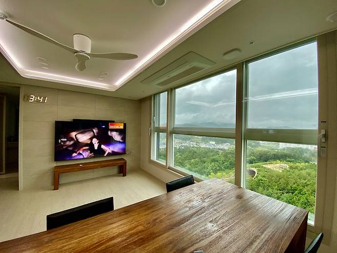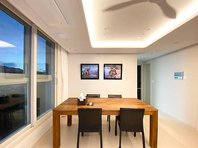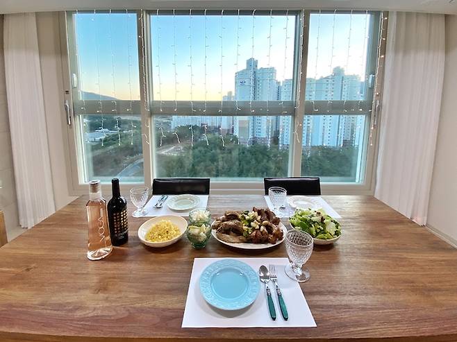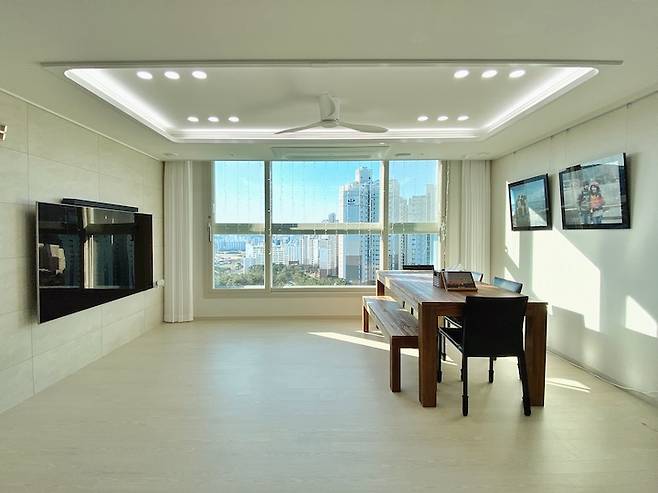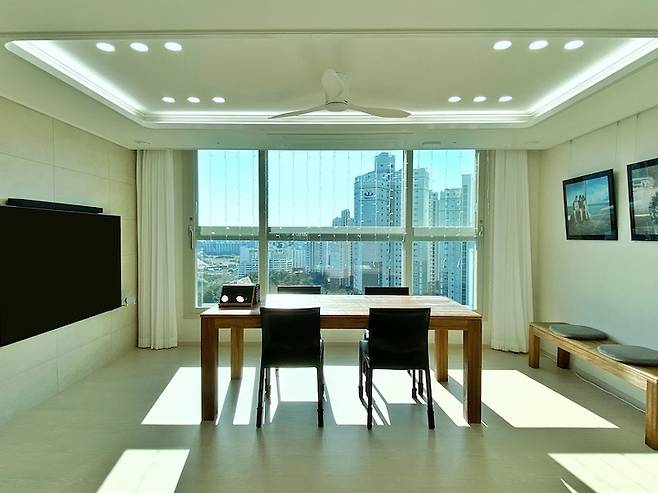 거실의 전체 모습입니다. 다른 집과 달리 소파가 없이 큰 식탁을 다용도로 사용 중입니다. 이전 집에서 사용하던 식탁인데 사이즈가 커서 이 집의 식탁자리에는 어림도 없는데다 우리 가족은 영화나 드라마를 보며 식사를 즐기기도 하고, 책도 읽고, 손님맞이도 식탁을 이용하는 편이라 만족하며 사용중입니다.