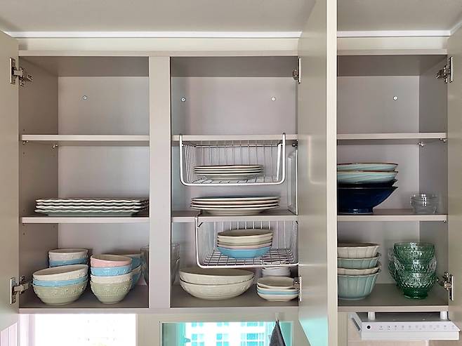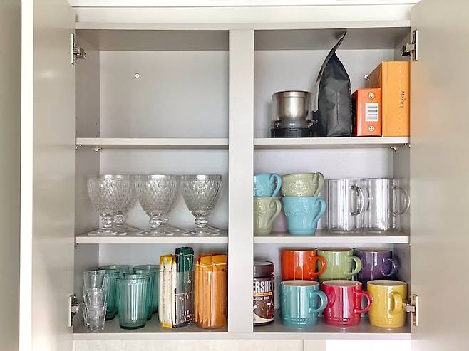 이번에 집들이 선물로 받은 머그컵 세트를 보니 오랜만에 신나더라구요. 싱크대안 제일 위칸은 비워두고 갑자기 공간이 필요할 때 요긴하게 사용해요.