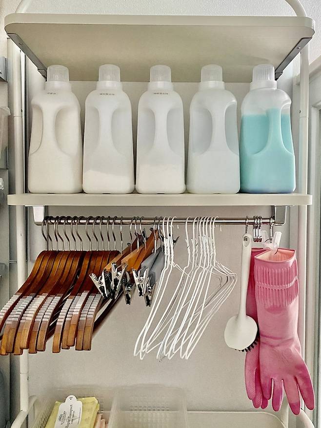 오른쪽 선반엔 이동행거가 같이 있는데요. 건조기에서 꺼낸 빨래를 바로 옷걸이에 걸어서 열을 식힌 다음 각방의 옷걸이에 걸어줍니다. 우리집엔 서랍을 거의 사용하지 않고 대부분의 옷을 걸어서 수납하기 때문에 요긴한 방법이지요.