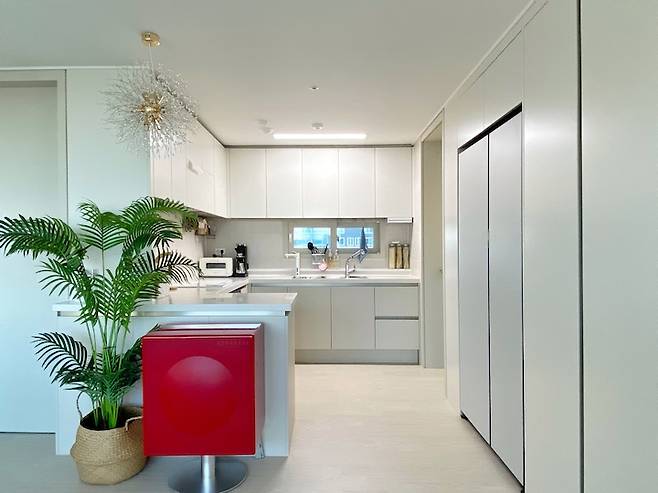 주방쪽 전체 모습이네요. 빨간 오디오가 있는 곳이 원래 식탁 자리에요. 4인식탁 자리라 과감히 포기하고 우리집을 카페로 만들어줄 음악담당을 배치했어요.