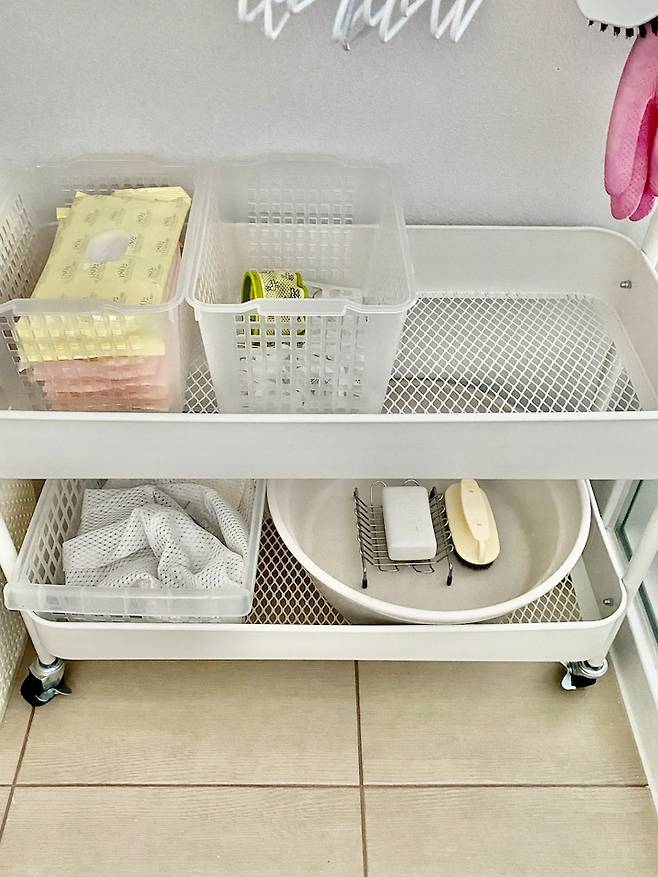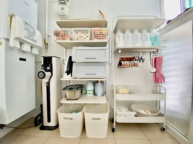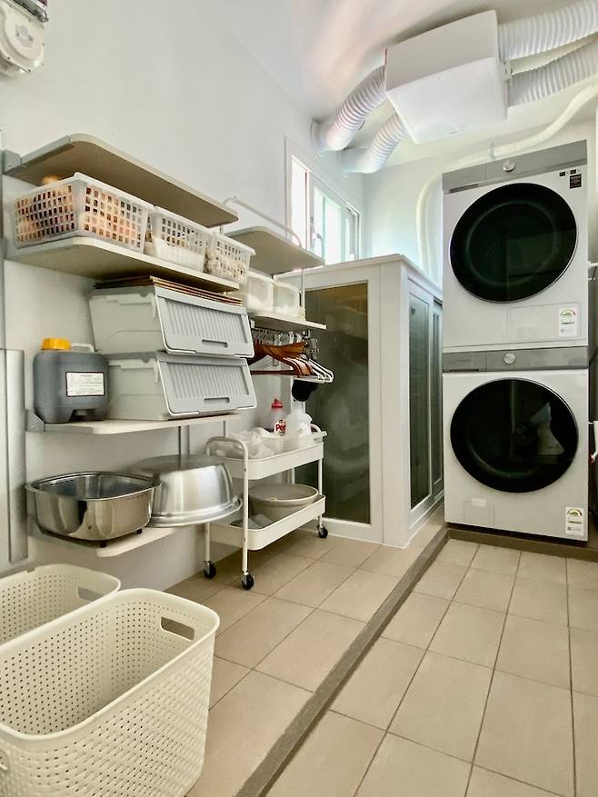 우리 집의 장점 중 하나인 다용도실! 여느 대형평수 부럽지 않은 크기에요. 정면으로 세탁기와 건조기가 있구요. 옆 쪽으로는 원래 설치되어있던 선반을 위치 조절해서 새로 설치해서 각각의 용도에 맞게 쓰고 있습니다. 잡다한 물건이 많은 다용도실인만큼 구역을 나누어서 정리했는데요. 여기 또한 수시로 변경이 많은 곳이에요.