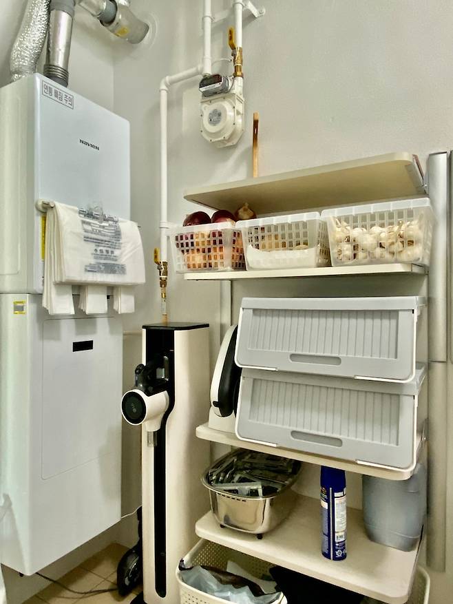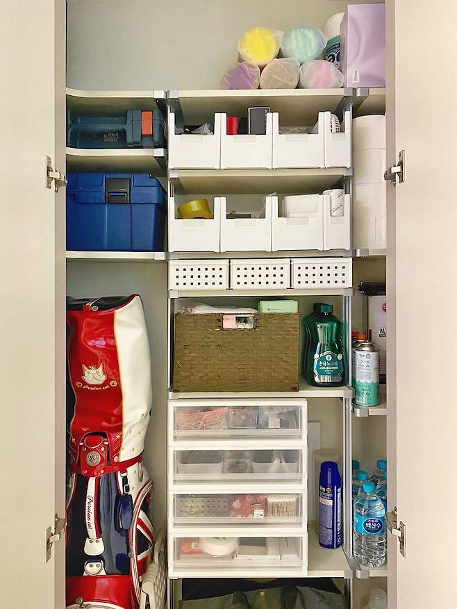거실 한쪽엔 작은 팬트리룸이 있는데 좀 많이 작아요~^^;; 그래도 최선을 다해 야무지게 넣어봅니다. 우리 집의 포인트는 수납이니까요!!