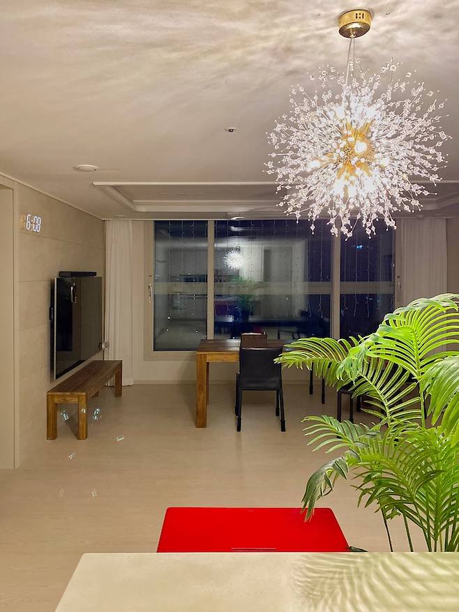 지금은 조명교체로 변화를 주었어요. 기존에 설치된 식탁조명을 위치만 조절해서 달아두었는데요. 깔끔하지만 왠지 밋밋한 느낌이었달까요? 전체적으로 단순한 우리 집에 살짝 화려한 느낌의 포인트가 되는 조명이 있으면 좋을 것 같더라구요. 이사오기 전부터 오래 검색하고 고민해서 고른 눈꽃조명인데 너무 예쁘죠?