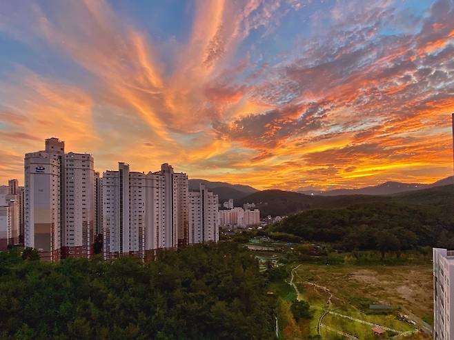 뭐니뭐니해도 우리 집의 자랑은 정남향에 녹지를 앞에 둔 멋진 뷰라고 할 수 있는데요. 계절의 변화와 날씨에 따른 변화무쌍한 모습이 너무 멋지답니다. 우리 집의 일몰과 일출뷰를 함께 구경해보세요.