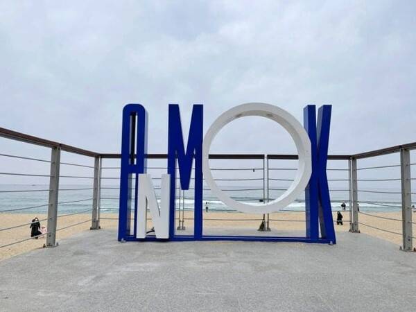 안목해변과 인근 강문해변에는 바다를 배경으로 한 다양한 포토존과 조형물이 마련되어 있습니다. 해변 산책로를 걷다 보면 바다 위에 설치된 그네, 대형 프레임, 하트 조형물 등 감각적인 포토스팟이 곳곳에 등장해요. 특히 강문해변의 ‘강문’ 포토존과 바다 위 솟대다리는 여행객들에게 인기 있는 인증샷 명소로 손꼽힙니다.
