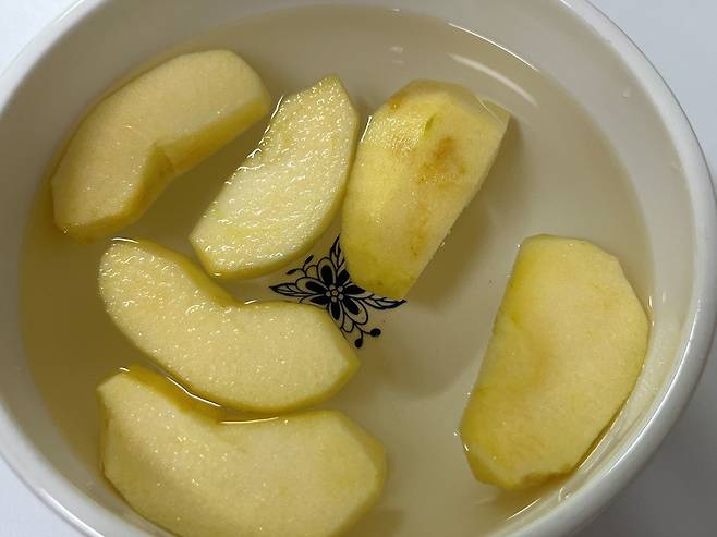 사과를 소금물 또는 식초물에 1분 정도만 살짝 담갔다가 꺼냅니다. 이렇게 하면 표면에 소독이 되어 사과 표면의 세균과 곰팡이를 제거하고 갈변을 늦추는 효과가 있습니다.