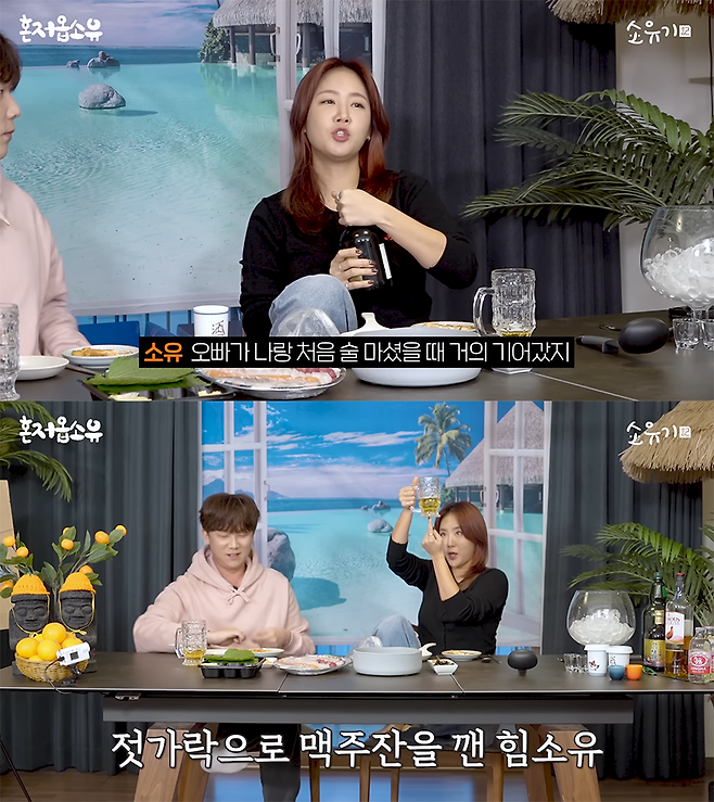 정기고는 소유가 글라스에 소주를 따라 마신다며, 소유와 처음 술 마신 날 자신이 집에 기어갔다며 놀라운 사실을 고백한 데 이어, 회사 전체 회식에서 소유가 소맥을 말다가 잔을 깨트리는 바람에 잘하게 되었다고...
