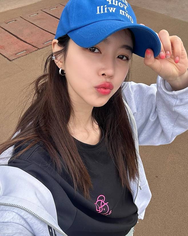 여기에 블루 컬러의 볼캡을 더해 얼굴을 더 또렷하게 살려주었고, 귀여운 볼드 후프 이어링으로 은근한 포인트를 더했어요.