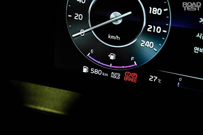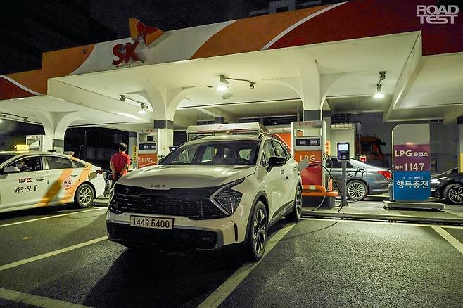 우리 팀은 실제 ‘풀-투-풀’ 연비를 확인하기 위해, 서울 강남→강원도 양양→다시 강남으로 이어지는 약 500㎞ 장거리 주행 테스트를 진행했다. 촬영을 위해 총 두 명이 탑승했고, 30°C를 웃도는 뜨거운 날씨 탓에 실내 온도는 23°C 오토에 맞추고 달렸다. 우선 사무실 인근 LPG 충전소에서 연료탱크를 가득 채우고 트립 컴퓨터를 초기화했다. 계기판 상 주행가능 거리는 약 580㎞가 나왔다.