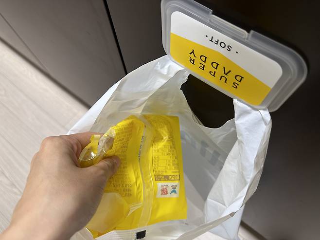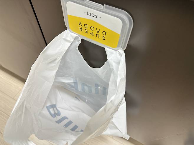 이렇게 뚜껑이 아래로 향하도록 붙인 후 비닐봉지를 뚜껑에 걸어주시면 주방 간이 쓰레기통이 완성되는데요.