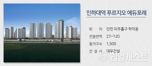 대우건설은 인천 미추홀구 학익동에서 ‘인하대역 푸르지오 에듀포레’를 분양합니다. 수인분당선 인하대역 역세권이며 추후 개통될 인천발KTX도 이용할 수 있습니다. 단지 바로 앞에 학익초, 인주중, 인하사대부속중·고, 인하대 등이 위치한 학세권 단지입니다.