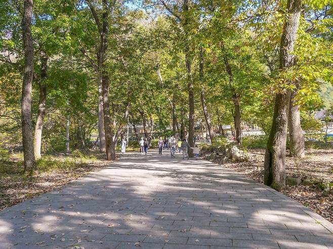 표충사까지 이어지는 산길은 단풍이 짙게 물든 시기엔 그야말로 장관입니다. 양옆으로 나무들이 터널을 이루고, 발밑에는 낙엽이 부드럽게 깔려 있어 걸음마다 바스락거리는 소리가 가을의 리듬처럼 들립니다. 중간중간 벤치가 마련되어 있어 잠시 앉아 산내음을 맡으며 쉬어가기 좋습니다. 특히 계곡 옆을 지날 때 들려오는 맑은 물소리는 복잡한 마음을 단숨에 내려놓게 만드는 자연의 위로이기도 합니다.