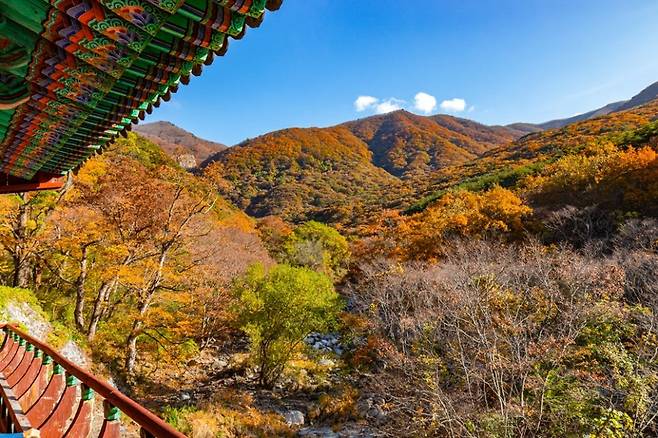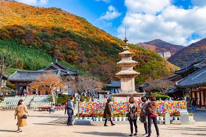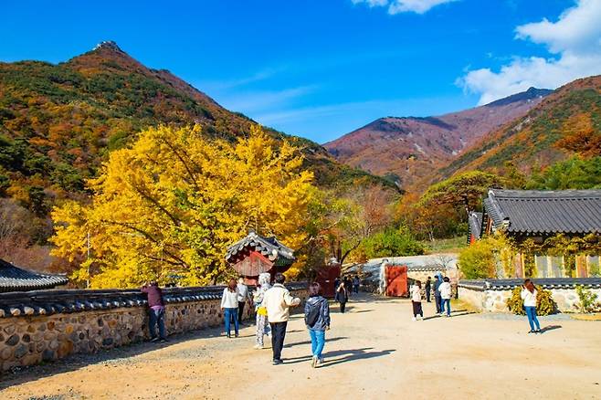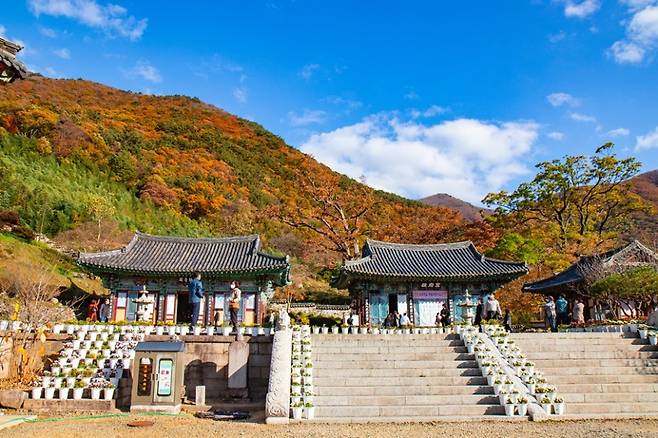 주차장에 차를 세우는 순간부터 노랗고 붉은 단풍나무들이 방문객을 맞이하죠. 길은 평탄하지만 오르막과 계단이 이어지는 구간이 있으니 편한 운동화 차림으로 걷는 것이 좋습니다. 주차장부터 사찰 입구까지 천천히 걸으면 산새 소리와 계곡 물소리가 어우러진 힐링의 산책길이 이어집니다.