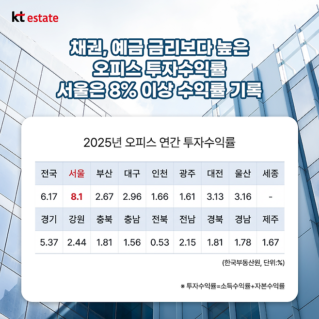 여기에 투자수익률을 놓고 볼 때도 서울 오피스 투자는 전통적인 안전자산인 채권이나 예금 금리보다 높은 편입니다. 한국부동산원의 투자수익률 통계에서 서울은 연간 8.1%를 나타냈으며, 이 중 강남지역은 10%이상(10.23%)의 높은 수익률을 기록했습니다.
