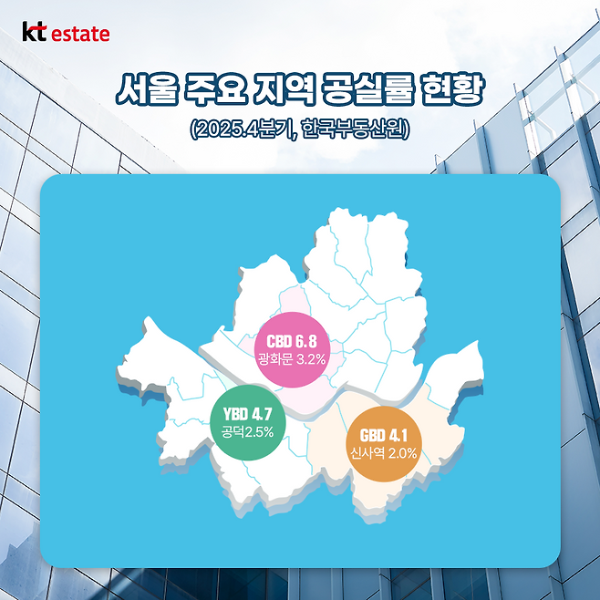 금융 산업의 중심지인 여의도·마포 권역(YBD) 역시 전체 평균 4.7%의 공실률을 유지하며, 세부적으로 공덕역 2.5%, 여의도 4.4% 등에서 탄탄한 임차 흐름을 이어가고 있습니다.