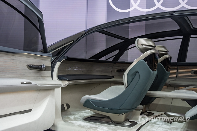 특히 350kW가 넘는 시스템 합산출력을 발휘하는 비전 AVTR의 전기구동트레인은 각각의 휠에 직접 연결된 4개의 고성능 전기 모터를 개별적으로 제어할 수 있어 지능적인 토크 배분으로 주행 상황에 따라 각 휠이 별도로 주행할 수 있는 것이 특징입니다. 프런트와 리어액슬을 동시 또는 반대 방향으로 구동할 수 있기 때문에 일반적인 차량과는 달리 약 30도(°) 가량 옆으로 수평이동이 가능해, 소위 ‘게 걸음’과 같은 움직임은 마치 파충류같이 움직이는 듯한 인상을 보여주었습니다.
