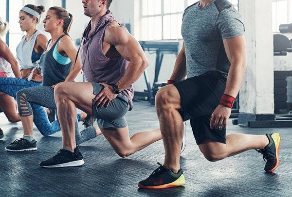 바닥에 서서 발을 모읍니다. 왼발을 앞으로 뻗고, 무릎을 90도 각도로 구부립니다. 앞발의 발꿈치로 지면을 밀며 원래 자세로 돌아옵니다. 오른발을 앞으로 뻗고, 동일한 방식으로 런지 동작을 반복합니다.