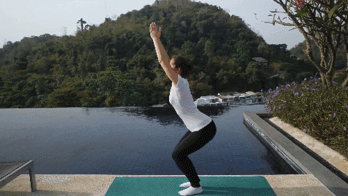 바닥에 발을 어깨너비로 벌리고 서서 준비합니다. 두 손을 머리 위로 올리고, 손끝을 뻗어줍니다. 무릎을 구부리면서 자세를 낮추며 엉덩이를 의자에 앉는 것처럼 자연스럽게 내립니다. 자세를 유지하면서 최대한 버팁니다.