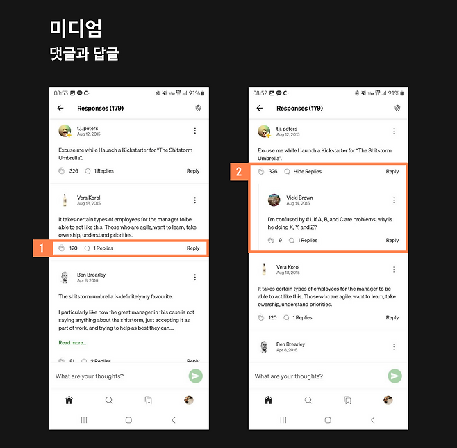 미디엄 역시 답글 기능을 제공하고 있어요. 브런치의 업데이트 후 버전과 다른 점이 있다면 사용자의 선택에 따라 확인이 가능하다는 점입니다. (1) 댓글에 대한 답글이 존재하는 경우 개수를 확인할 수 있으며 (2) 답글을 탭 하면 내용을 확인할 수 있도록 구성된 모습입니다. 미디엄은 왜 답글을 가려놨을까? 고민해 봤는데, 아무래도 답글은 댓글과 연관성이 높기 때문이라는 생각이 들었습니다. 댓글은 글에 대한 구독자 또는 사용자의 의견이기에 바로 확인하는 것이 좋지만, 답글은 댓글의 내용에 따라 보고 싶을 수도, 그렇지 않을 수도 있기 때문입니다.